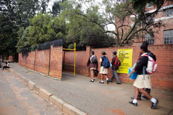 Grâce à un échafaudage, l’apparence de certains mur d’Afrique du Sud est reproduite afin de simuler la disparition des piétons. Une opération menée par l’organisation Internationale de la Migration – IOM.